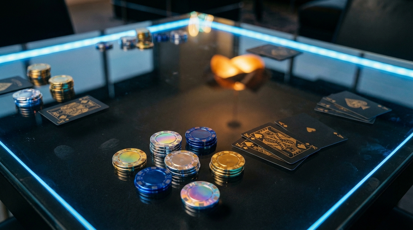 Glass poker tables. LED and neon lighting. Holographic chips. Heavy jewelry. Black, gold, chrome. This isn’t just aesthetic — it’s a statement. We create the environment. We control the vibe. We own the room.
